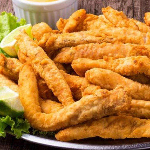 Pedaços de peixe empanado frito. Acompanha molho especial
