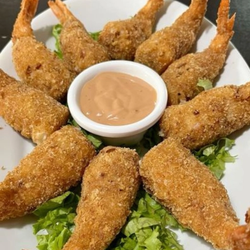 Camarão empanado frito. Acompanha molho especial